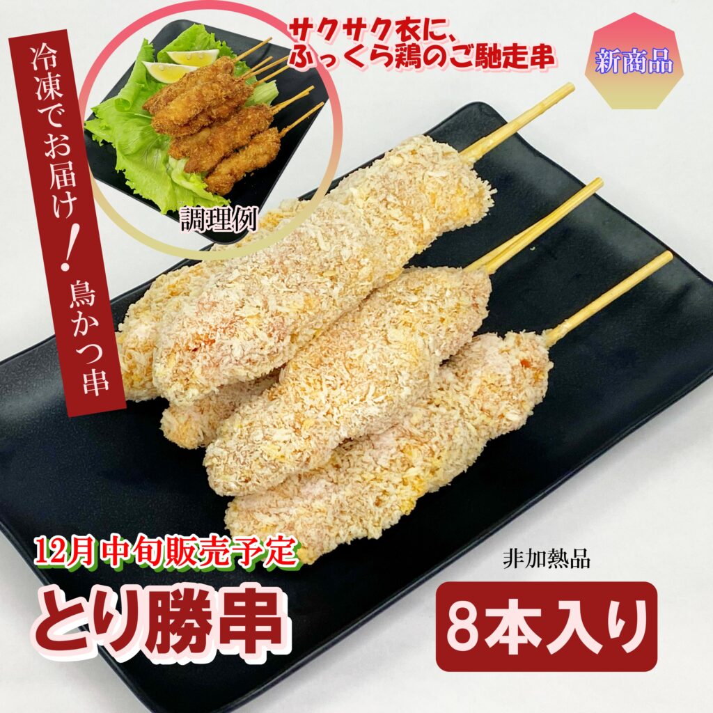 弊社の勝社長が拘りに拘り作った鳥カツ串です。塩と胡椒のシンプルな味付けながら、絶妙なバランスでしっかりした美味しい鳥カツ串に仕上げています。そのまま食べても良し、お好みでソースやタルタルを付けて味合うのも最高です。お客様の笑顔を思い浮かべ、一本一本手作業で作った鳥カツ串をご賞味下さい。