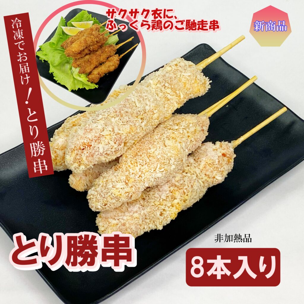弊社の勝社長が拘りに拘り作ったとり勝串です。塩と胡椒のシンプルな味付けながら、絶妙なバランスで美味しく仕上げています。そのまま食べても良し、お好みでソースやタルタルを付けて味合うのも最高です。お客様の笑顔を思い浮かべ、手作業で作ったとり勝串をご賞味下さい。